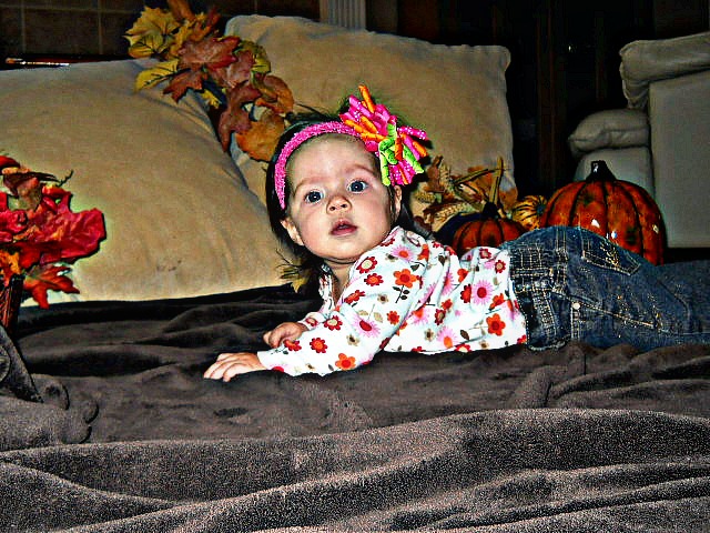 This little girl is on the move, she is rolling everywhere, it seems that I can't leave her for a moment. One day Rusty and I were in the office looking at something on the computer for a short while, and Sophia was in the living area on the floor, when we came back into the room we saw she was not in the spot we left her, half of her body was under the sofa!! It was hilarious. She used to have a small mat she played and played on, that small mat has been substituted for a Full sized comforter we lay out on the floor so she can roll wherever she would like. I have been working more with teaching her to crawl, she will get on her knees and push off, the only thing is she is scooting on her face because she will not use her arms yet. Her poor face, as soon as I prop her arms to stay up front she automatically takes them to her sides. Oh well, practice, practice, practice. She is getting pretty good at sitting up for longer periods of time, by long I mean 5-10 seconds or so. ; )